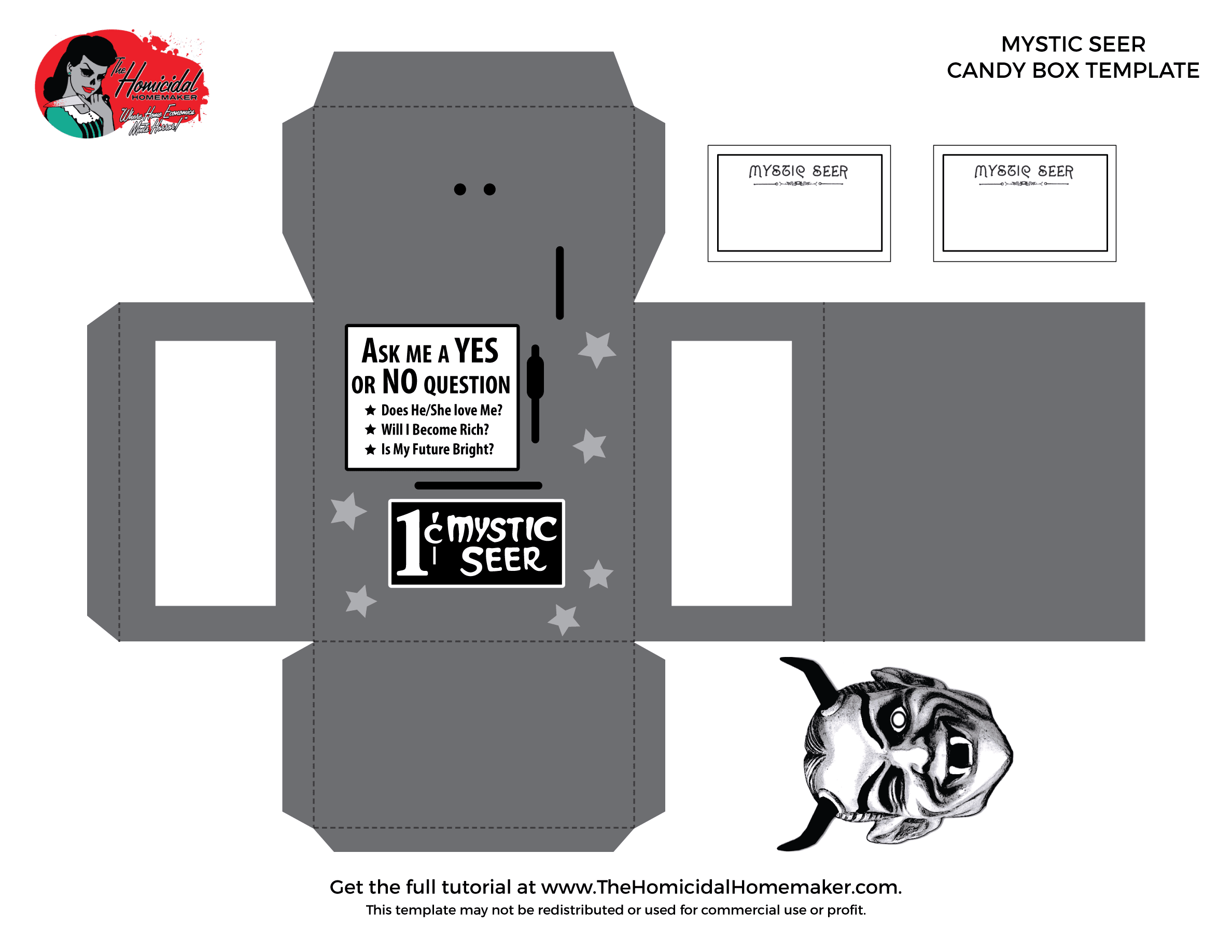 While this Twilight Zone Mystic Seer Candy Box won’t be able to look into your future for a penny, it will be able to deliver you whatever delicious goodies you decide to put inside. Fill it with chocolate coins, black-&-white candies, or my recipe for my Twilight Zone Spiral of Madness cookies. I’ve even included some blank Mystic Seer cards for personalizing the candy boxes for the recipient!